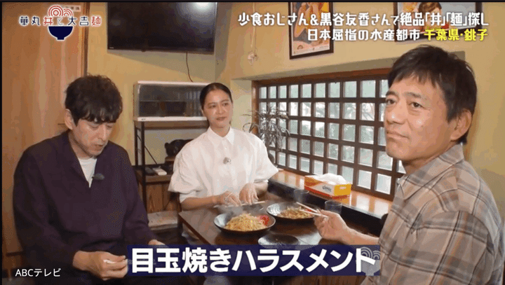 少食おじさんの博多華丸・大吉が、ただただ食べたい丼か麺を探し求める街ブラ番組『華丸丼と大吉麺』(ABCテレビ)。千葉県・銚子編の第3回(最終章)では、華丸おじさんの言動を、華丸とゲストの黒谷友香が「目玉焼きハラスメント」認定する事態が発生した。