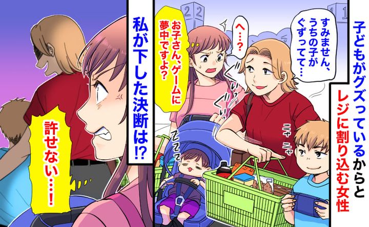 「お子さん、ゲームに夢中ですよ?」子どもがグズっているとレジに割り込む女性。許せない…私の決断は!