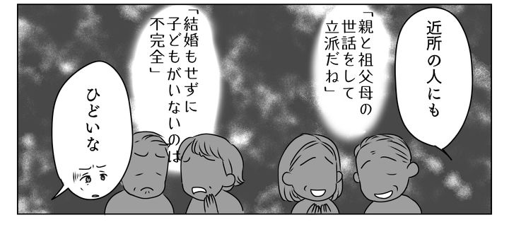 「近所の人にも『親と祖父母の世話をして、立派だね』って言われる一方で、『結婚もぜずに子どもがいないのは不完全』みたいな見方もされるの」たしかに、それだけ実家に尽くしているのに、悪く思われるなんてひどい話です。「人生一回だって思うと、もうあんなところにいるのはまっぴら!」