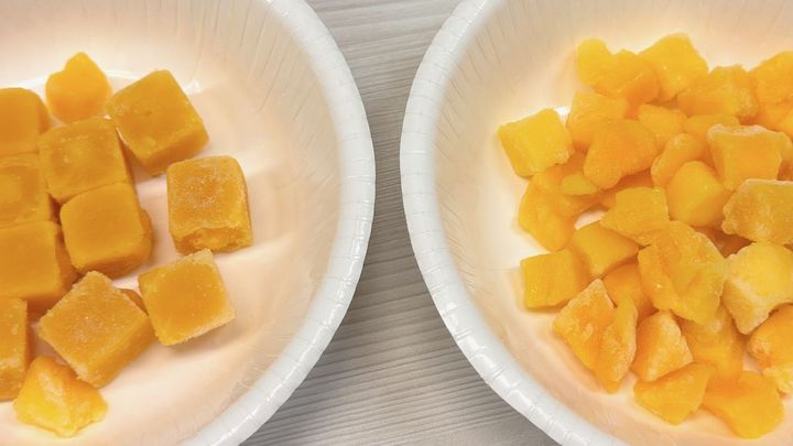 カップの中身は、急速凍結されたマンゴー果肉(写真右)と、マンゴーピューレなどを固めたアイスキューブ(写真左)。果肉は、酸味と甘みのバランスがよいベトナム産マンゴーが使われています。アイスキューブにも、配合にこだわりが! 濃厚な甘みが特徴のアルフォンソマンゴーのピューレ、パッションフルーツピューレ、フルーツの果汁などを加え、スムージー全体の味バランスを整えています。