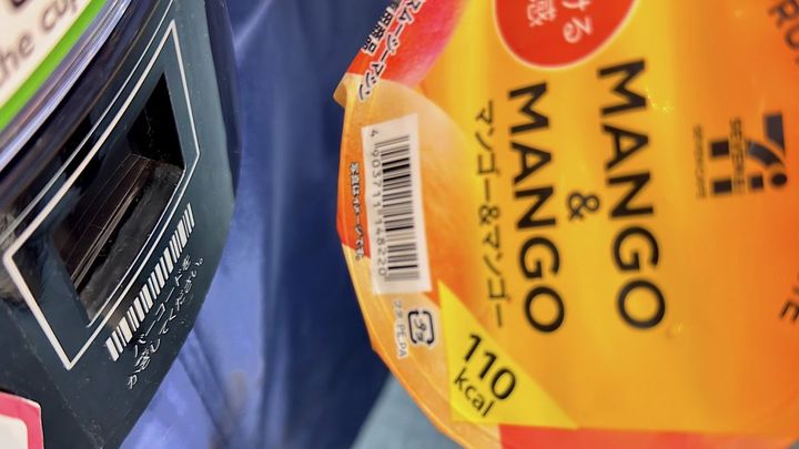 次にスムージー専用マシンのところに行き、センサーにラベルのバーコードをかざして読み取ります。