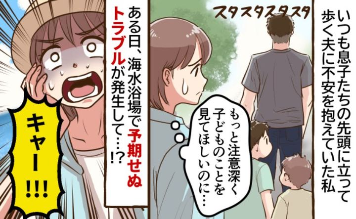 外出時、自分が先頭になり、後ろに息子たちを従える形で歩くことが多い夫。私はそんな危機意識の低い夫の姿を見て、いつか息子たちが事件や事故に巻き込まれるのではないかと心配していました。そしてある日、海水浴場で事件が起きてしまったのです。