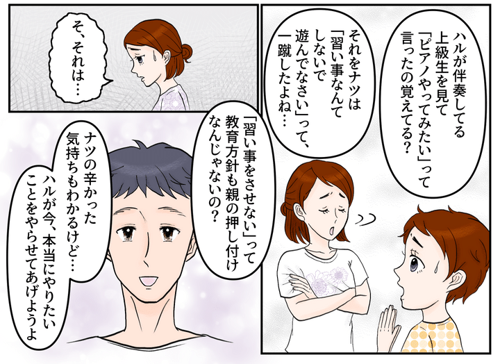 私はナツ。夫のアラタと小学5年生の娘ハルと暮らしています。子どものうちはのびのび遊んでほしいと思い、ハルにはこれまで習い事もさせてきませんでした。一方で義姉の娘ミサキちゃんは、週に6日も習い事をして大忙し。義姉が「なんでも一番になるべき」という教育方針を押し付けているようで、私は見ていられませんでした。けれど夫にそれを伝えると、逆に言い返されてしまったのです。「自分の方針を押し付けようとしてるのは、ナツの方なんじゃないの?」
