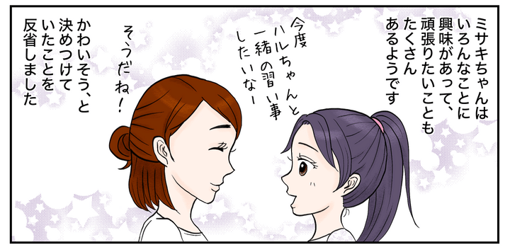 ハルの希望を「習い事なんて必要ない」と受け流していたことも、親から子どもへの価値観の押し付けだったのかもしれません。よその子の心配ばかりして、わが子の気持ちに寄り添っていないことに気付かなかった私。これからはさまざまな価値観があることも意識しながら、よりよい方法を探っていきたいと思います。