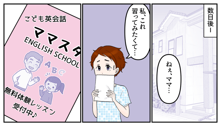私はミサキちゃんに自分の子どもの頃の姿を重ねて、勝手にかわいそうと決めつけてしまっていたのです。そして数日後、ハルがおずおずと1枚の紙を差し出してきました。近所でやっている英会話教室のチラシのようです。
