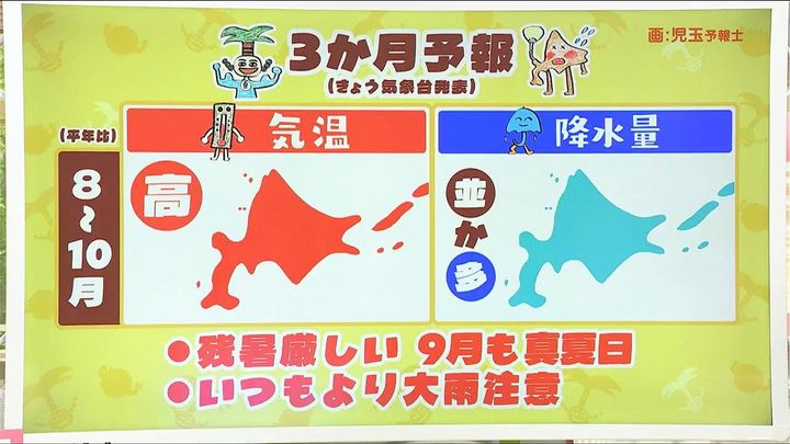 きょう22日(火)発表の3か月予報です。暑さが続きます…期間を通して気温は平年より高いです。お盆を過ぎても残暑が厳しく、9月でも真夏日が続出するでしょう。南から湿った空気も流れ込むため、降水量は平年並みか多く、大雨に一層の注意が必要です。