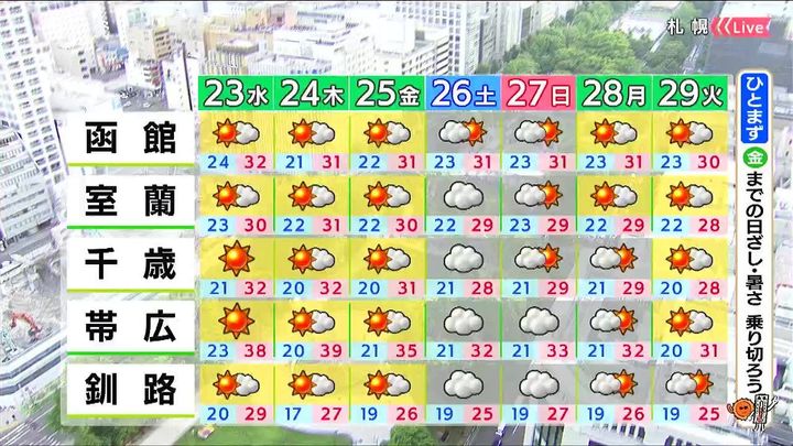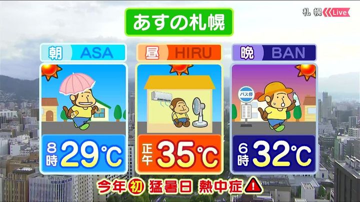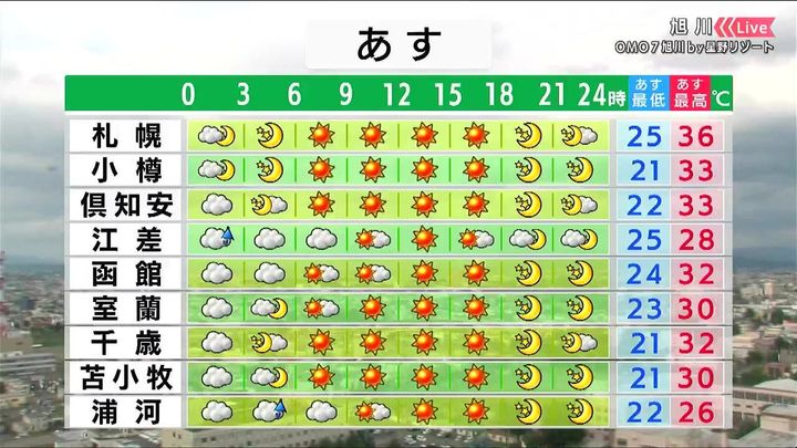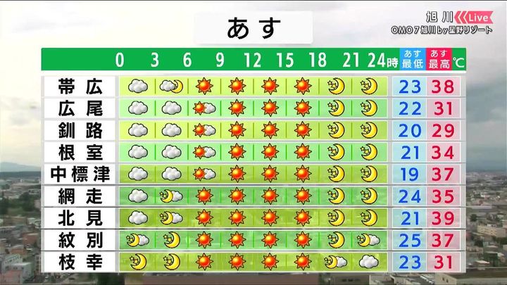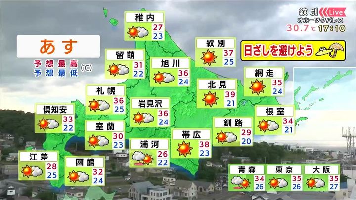 各地で晴れて、あすはにわか雨もなさそうです。最高気温は網走35度、札幌や岩見沢は36度で今年初めての猛暑日です。紋別は37度、帯広38度、北見は39度です。日傘などで日ざしを避けて少しでも涼しく過ごしてください。