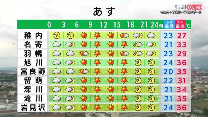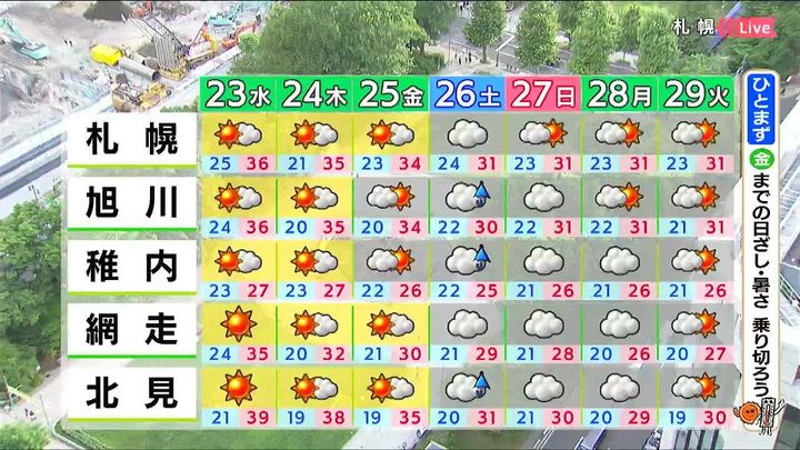 旭川のあす23日(水)は今年2度目の猛暑日、36度まで上がりなりそうです。