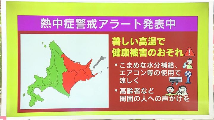 熱中症警戒アラートが網走、北見、紋別、十勝、釧路、根室地方に発表されました。健康被害のおそれがあります。外出はなるべく短時間にして、こまめな水分補給、エアコンや扇風機を積極的に使う、見守りや声掛けも行いましょう。発表されていない地域でも十分に注意して下さい。屋外での運動も控えましょう。