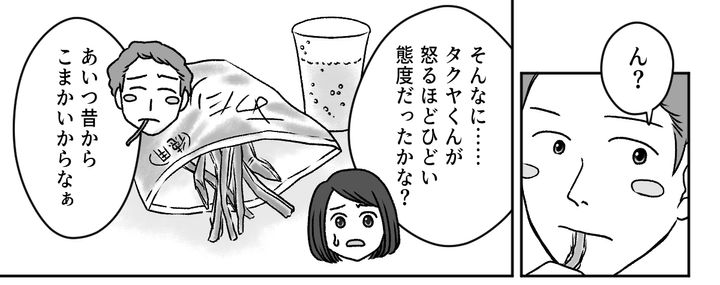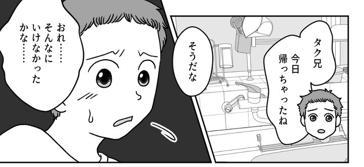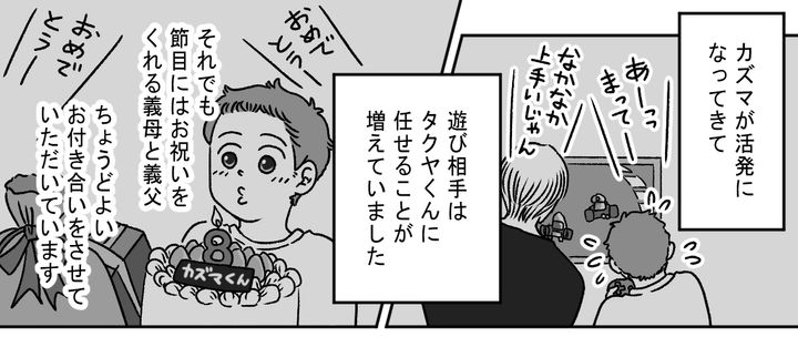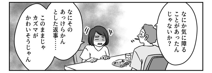 しかし、このままでは「よくわからないまま嫌ってくる人がいる」とカズマは考えるかもしれません。それも相手は叔父。カズマにとって身近な大人です。カズマがタクヤくんにイヤな接し方をしていたなら改めたい。それに、カズマのしょんぼりしている姿は母として見ていてツライものがあります。