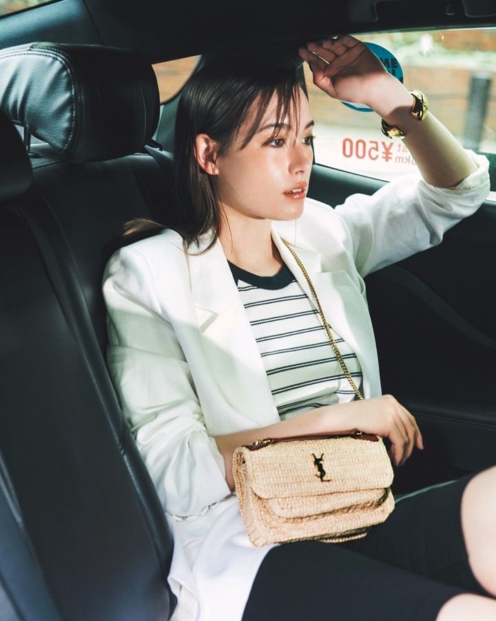 バッグ小「ミニニキ」〈H12.5×W18×D5cm〉¥319,000バングル¥127,600※参考価格(すべてサンローラン バイ アンソニー・ヴァカレロ/サンローラン クライアントサービス)ジャケット¥69,300(アルアバイル)カットソー¥2,290(UNIQLO)パンツ¥8,910(ビューティー&ユース/ビューティー&ユース ユナイテッドアローズ丸の内店)