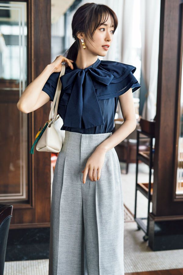 襟と一体化したボリューム袖で、ほっそり腕に。肩まわりまで覆うビッグカラーブラウスは二の腕の肉感をドレッシーにカムフラージュしてくれます。パンツと合わせて、ネイビー×グレーの配色でまとめれば知的な印象に。