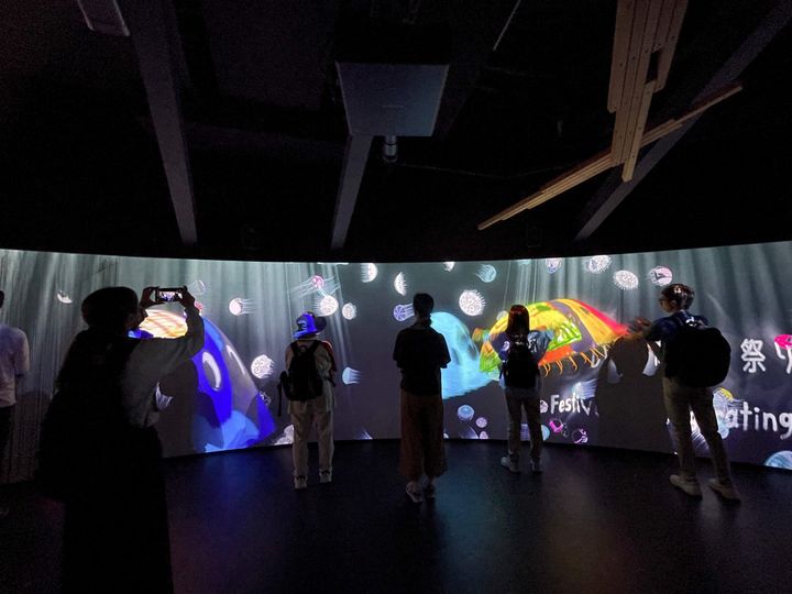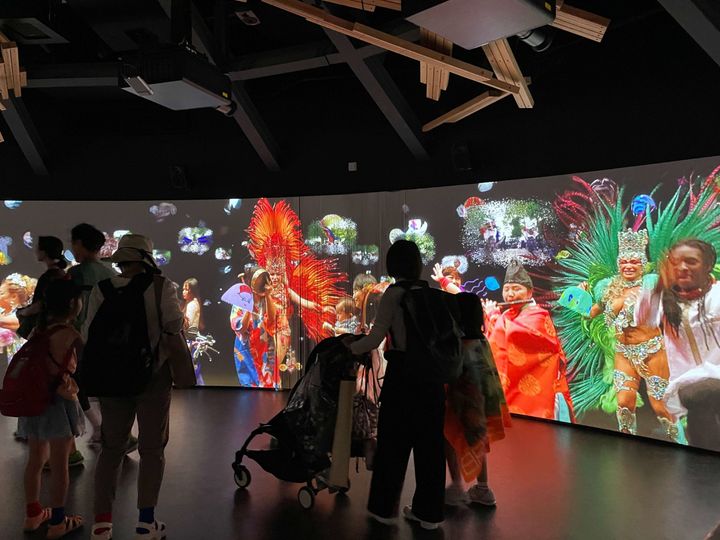 映像は国内外の祭りを巡る旅へと続き、アイヌの儀式から、アフリカや南米のエネルギッシュなダンスまで、息をつく間もない没入感。クライマックスでは、なんと主役は私たちに。音楽家による生演奏が始まり、スタッフさんの誘導で、見知らぬ人たちと一緒に、自由に歩き、踊り出す時間が訪れます。