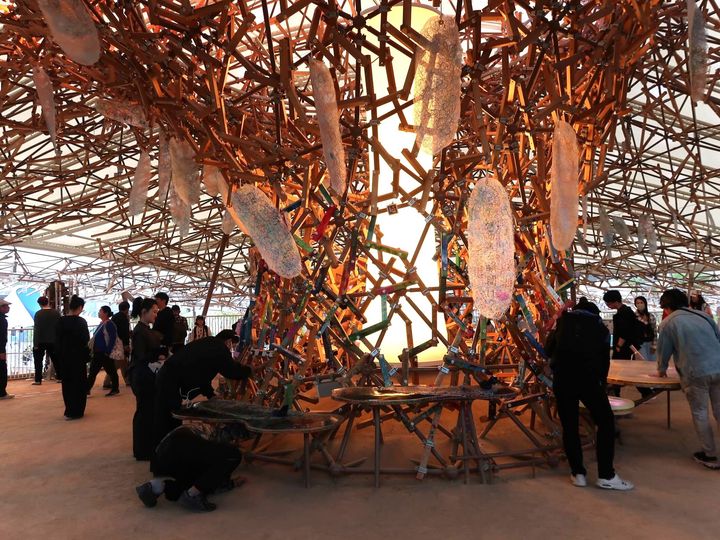 中央部にあるのは「創造の木」。万人万物のいのちの創造性を象徴する木で、4,600本ほどの吉野杉からできた角材を組み合わせて、複雑にゆらぐクラゲ膜の形を形作っています。