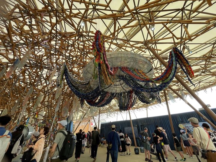 クラゲのようなフォルムが印象的なこのパビリオンは、作曲家でSTEAM教育者の中島さち子さんがプロデュース。0歳から120歳まで、すべての人が“こども”のように、感性のおもむくままに遊び、学び、響き合う場所です。クラゲ館には、遊び心をくすぐる丘「プレイマウンテン」、音や展示を自由に体感できる「いのちのゆらぎ場」、そして創造性と向き合う予約制の地下空間「いのちの根っこ」の3エリアが。まるで自分の中に眠っていた“なにか”が目を覚ますような、そんな不思議でワクワクする体験が待っていました。