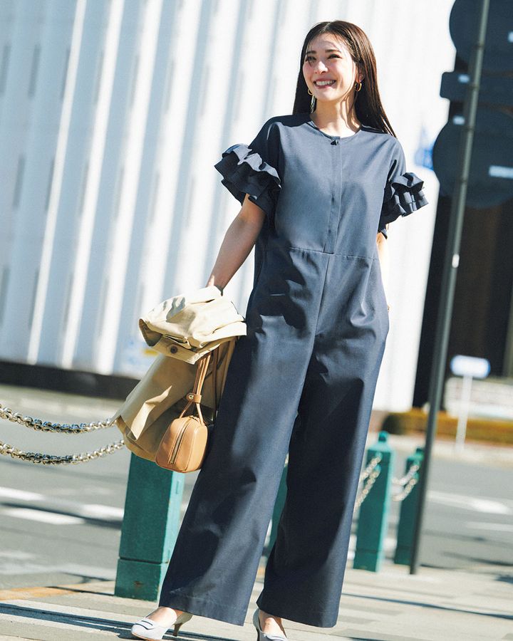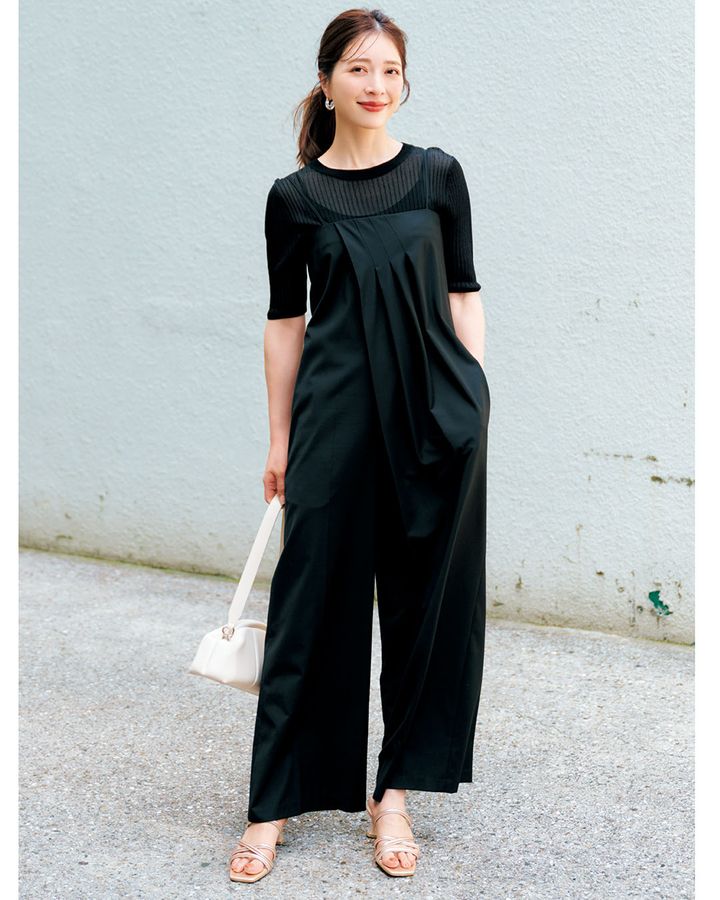 ④きれいめにもカジュアルにも使える「体型カバーオールインワン」