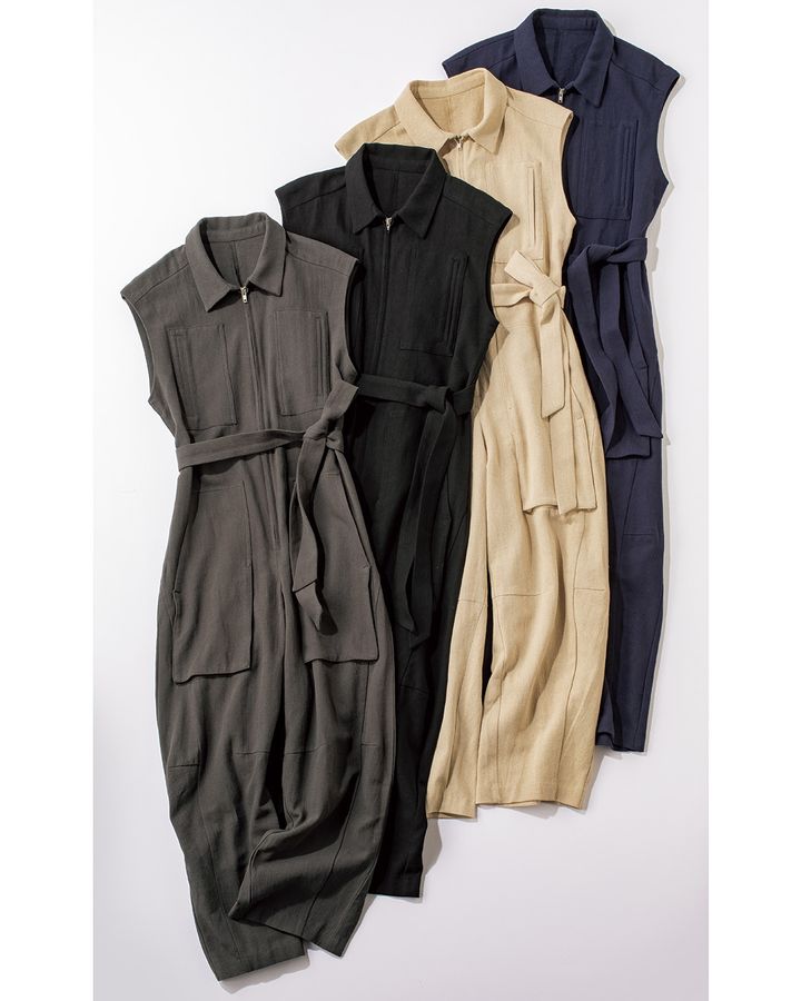 パンツ部分のコクーンシルエットが今っぽさを作り出すオールインワン。リネン混の素材は涼し気で真夏でも心地よく着られます。フロントジップを開けると女性らしく、閉めるとマニッシュな印象に。