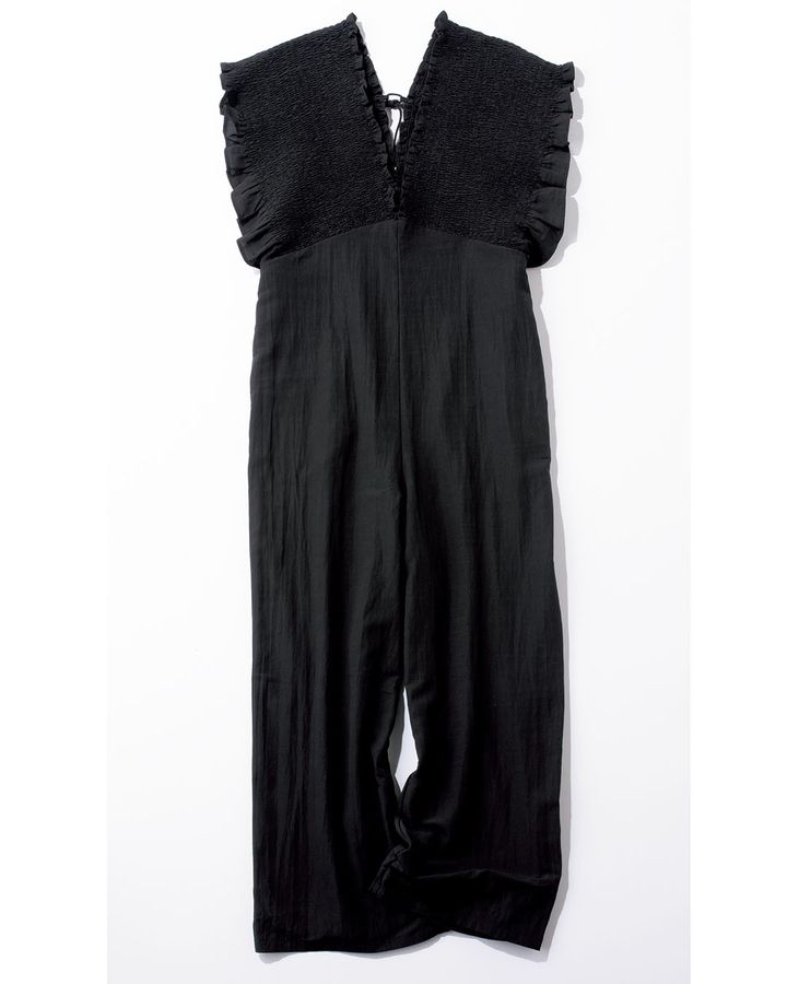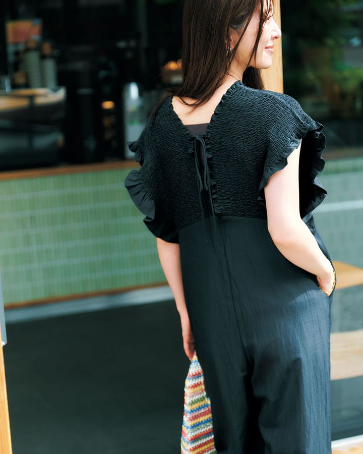 ➀伸縮性のあるギャザーでストレスフリーな「楽ちんオールインワン」