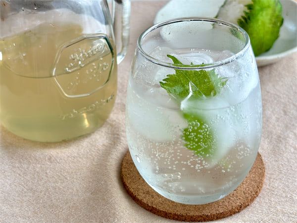 コップに氷を入れ、青じその葉を1枚入れます。香りも見た目も爽やかです。青じそジュース1に対し炭酸水3の割合で入れてみました。