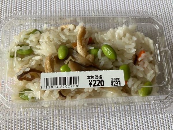 237円。枝豆の鮮やかな緑色が美しいおこわです。「きれいなおこわ・・」と手に取りうっとり。 帰宅後すぐ昼食にいただきました。ほんのり塩味の効いたおこわはおいしすぎ。「もっと買ってくればよかった」と後悔。 季節の味を堪能しました。