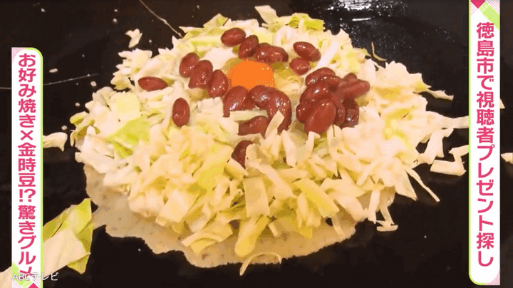 大仁田アナがやってきたのは、創業60年のはやしのお好み焼。地元民に長年愛されている名物・豆天玉は、薄く広げた生地と大量のキャベツの上に、生卵と海老天、さらには甘~い金時豆をトッピングしたもの! 徳島では昔から甘党の人が多く、一般家庭のお好み焼きに金時豆を入れていたのが、豆天玉の始まりらしい。