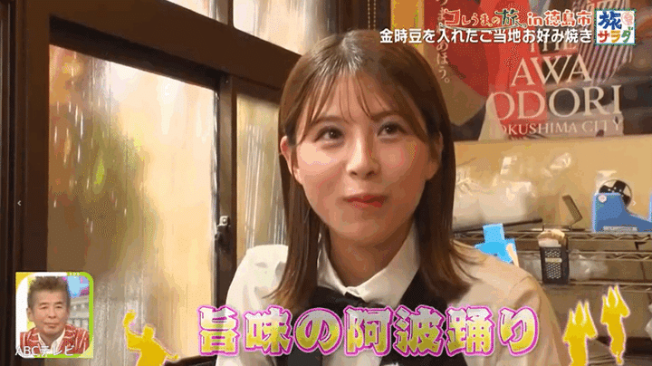ABCテレビの大仁田美咲アナウンサーが、旅バラエティ番組『朝だ!生です旅サラダ』(ABCテレビ)のロケで徳島県徳島市へ! 思わず阿波踊りをするほど驚いた、意外な具材が入ったお好み焼きを味わった。