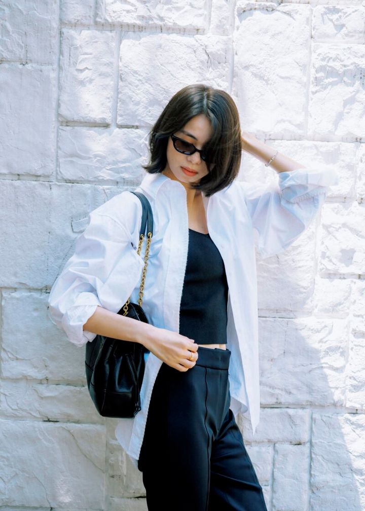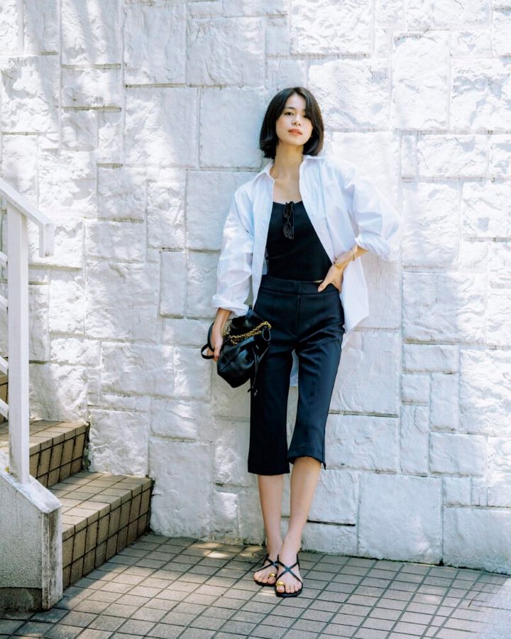 「普段から基本的にシンプルなスタイリングが定番。昨年の夏は大人っぽくキレイめなテイストが気分だったのですが、今年はもう少しトレンドを意識したいと思っていて、選ぶアイテムもシンプルながら旬を感じるものに惹かれます。早速ワードローブに取り入れたのがこのカプリパンツ。絶妙な丈感が新鮮でちょうどいいミーハー感もあり、今年っぽさを叶えてくれるので即戦力になりそう。ビッグシャツを羽織ったモノトーンのミニマルな装いで、自分らしいスタイルに仕上げました」