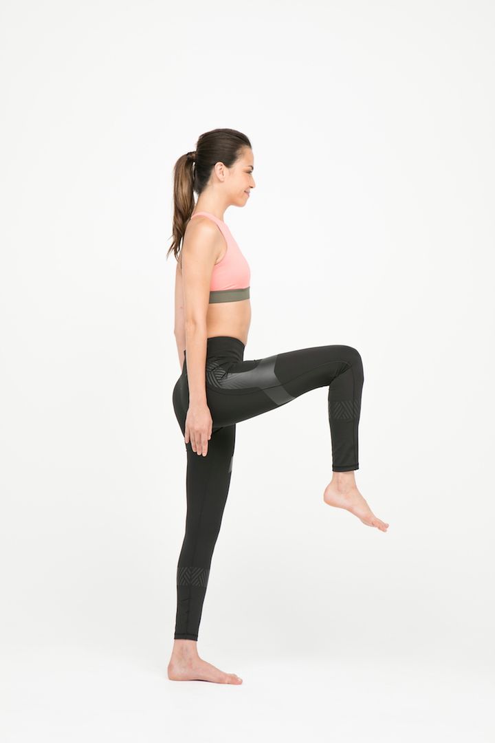 1.片脚を床と水平の高さまで上げ、ヒザを90度に曲げる。この状態で30秒キープする。