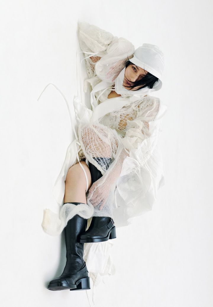 フリルブラウス¥182,600、ニットドレス¥276,100、ヘッドピース¥139,700、腕に着用したレッグウォーマー¥83,600、ブーツ¥309,100(全てアン ドゥムルメステール/エム)、ブラトップはスタイリスト私物