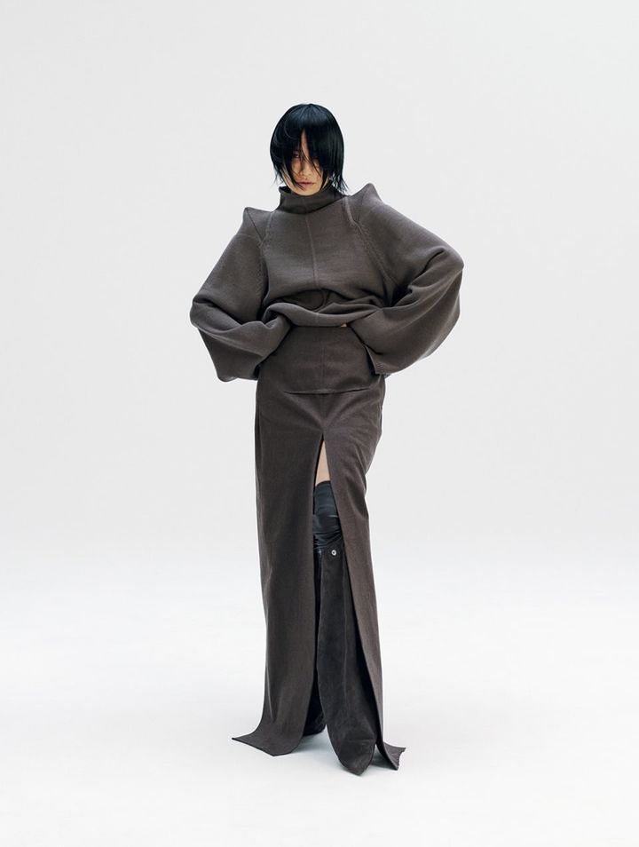 パワーショルダーニット¥261,800、フロントスリットスカート¥202,400、キスブーツ¥663,300(全てリック・オウエンス/イーストランド)