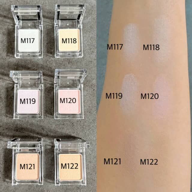 例えば、パールなしのハイライト「M117」「M118」は、くすみや毛穴のカバーにも優秀。血色感を偽造する「M119」「M120」は涙袋やチークぼかしにぴったり。そして「M121」「M122」は涙袋の影やノーズシャドウなどに重宝する影色で、簡単にメリハリ顔が完成します。