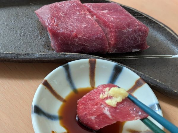 ブロックの馬刺しと、専用のタレ・おろし生姜が付いています。