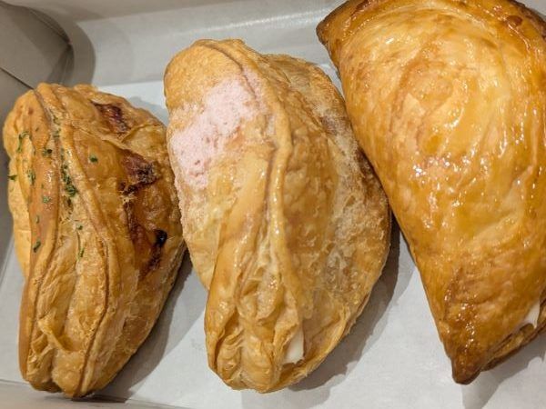エントリーしているのは、「世界一のパイ3種(右からアップルパイ、あまおうストロベリーパイ、明太チーズポテトパイ)」(各500円) 「あまおうストロベリーパイ」と「明太チーズポテト」はマイング店限定です。サクッという音と共に、フランス産発酵バターの香りが口の中に広がります。こだわりの素材とレシピでつくられた、贅沢なパイです。焼き上げた後、いったん冷ましてから豆乳チーズクリームを後入れして、店頭に並べられます。