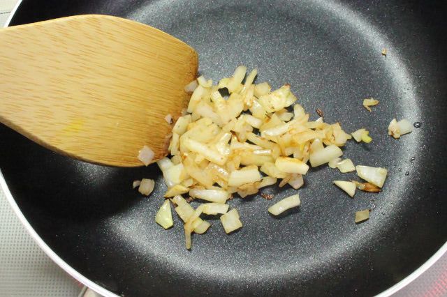 みじん切りにした玉ねぎは半分に分け、半量だけ炒めます。