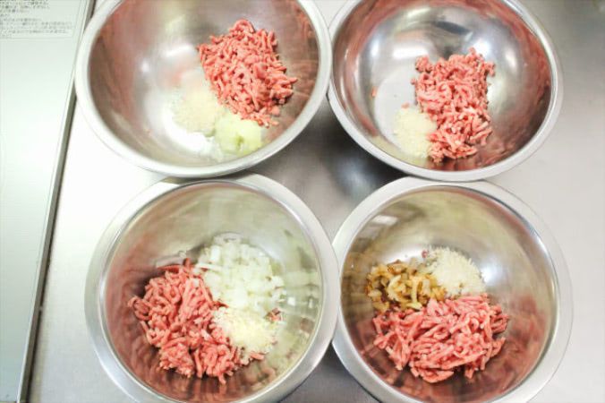 そんな玉ねぎの使い方が気になった投稿主さんは、「生みじん切り」「炒めみじん切り」「生すりおろし」と、玉ねぎの形状を変えて材料を準備。さらには「玉ねぎなし」も加え、ハンバーグ4個の味わいを比較検証していましたよ。