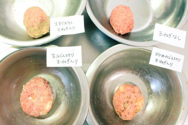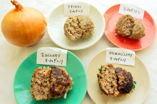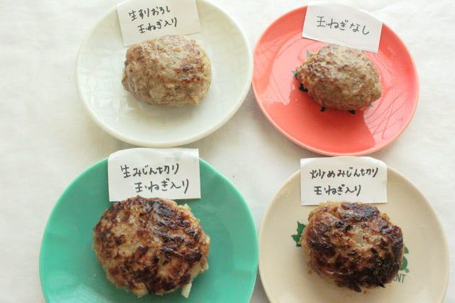「生みじん」「炒めみじん」「生すりおろし」「玉ねぎなし」を食べ比べ!