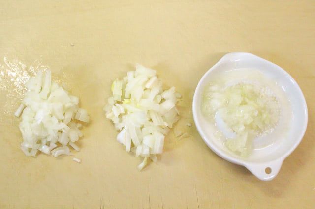 1. 玉ねぎの2/3の量をみじん切りに、1/3の量をすりおろします。
