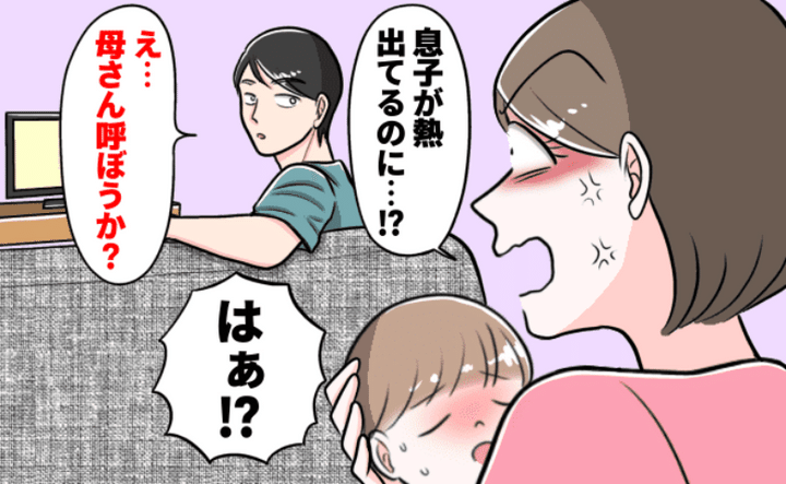 その日はたまたま夫が昼からの出勤だったので、病院の診察時間までいつも通り2人でテレビを観ていました。すると突然、寝ていた息子が泣き始めたので再び熱を測ると、なんと40度超え。このままでは娘のお迎えに行けないので、夫に休みを取るか出勤を遅らせて貰えないかと相談しました。すると夫はものすごく嫌そうな顔をして「えー? 俺?」「なんで? お迎え一緒に連れて行けばいいじゃん。」「それかお母さんに来て貰う?」と言われ、私はブチ切れ! 仕事が大事なのはよくわかるのですが、息子を病院に連れて行きたいし、こんな高熱のある子を炎天下の中お迎えに連れて行けるはずがありません。