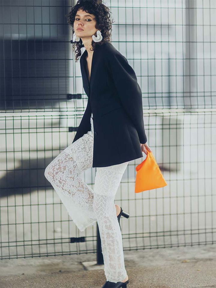 白ドッキングレースパンツ/メゾンスペシャル(メゾンスペシャル 青山店) 黒ノーカラージャケット/アキラナカ(ハルミ ショールーム) ピアス/ザラ(ザラ カスタマーサービス) ロゴバッグ/ホリデイ(ホリデイ/フラッグシップサロン オフィス) サンダル/ジェイヴィーエーエム(トゥモローランド)
