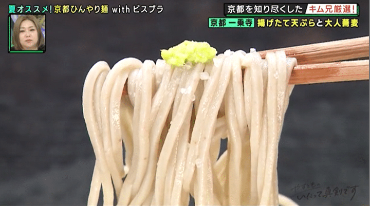 まずは、一乗寺にある“そば”の名店へ。キム兄が夏になると必ず足を運ぶというこちらは、そばのみならず厳選されたお酒のラインナップも豊富だ。そこで、まずは「ちょっとたしなみながら…」とおいしい日本酒をいただきつつ、メインの麺を待つかと思いきや、すぐにそばを頼まないのがキム兄流。「京都の夏といえば…」と京の夏の風物詩としても知られる小粋な一品をオーダーして…。そして、お待ちかねの麺が登場! 「大人の階段、登っちゃうな〜」とビスケットブラザーズ・きんを感動させた夏のイチオシ麺とは?