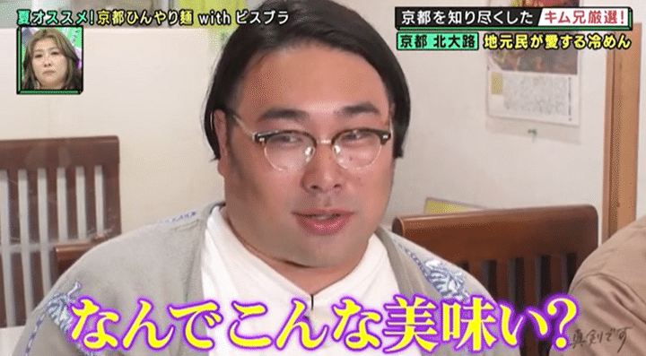 続いて訪れたのは、北大路にある中華のお店。京都で中華といえば「ここは行っとかなアカン」とキム兄もリスペクトする名店で、なんといってもイチオシは、地元の人のみならず有名人にもファンが多い麺料理。もともとは夏期限定メニューだったが、冬にも食べたいというお客さんたちの熱いリクエストに応え、年中提供するようになったという。シンプルな具がモチモチの太麺にからむ至福の一皿に、「なんでこんなにうまいん?」「今まで食べた中で一番おいしい!」とビスケットブラザーズ・原田は大感激!