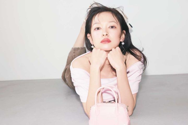 森絵梨佳。ar7月号より トップス¥6,930/リリー ブラウン パンツ¥5,940/アントマリーズ(アンティローザ) イヤリング¥3,850/マチルダローズ(ハチマルゴショールーム) バッグ¥13,320 /アルキアルカ(ハナ コリア) サンダル¥8,900/チャールズ&キース