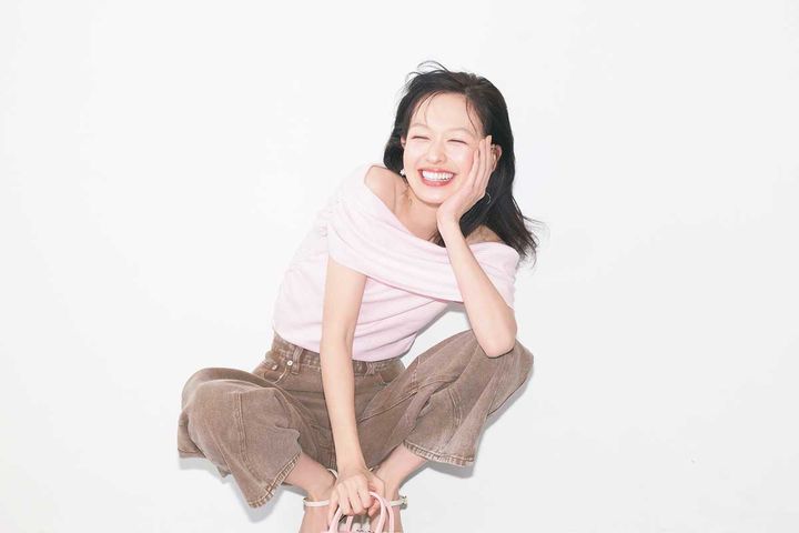 ガーリーなピンクは甘すぎないオフショルデザインをセレクト。視線を集めるだけじゃなく、鎖骨が見えることでスッキリ感もレベチ♡ブラウンのデニムを合わせて、さらにトレンド感あふれるコーデに。