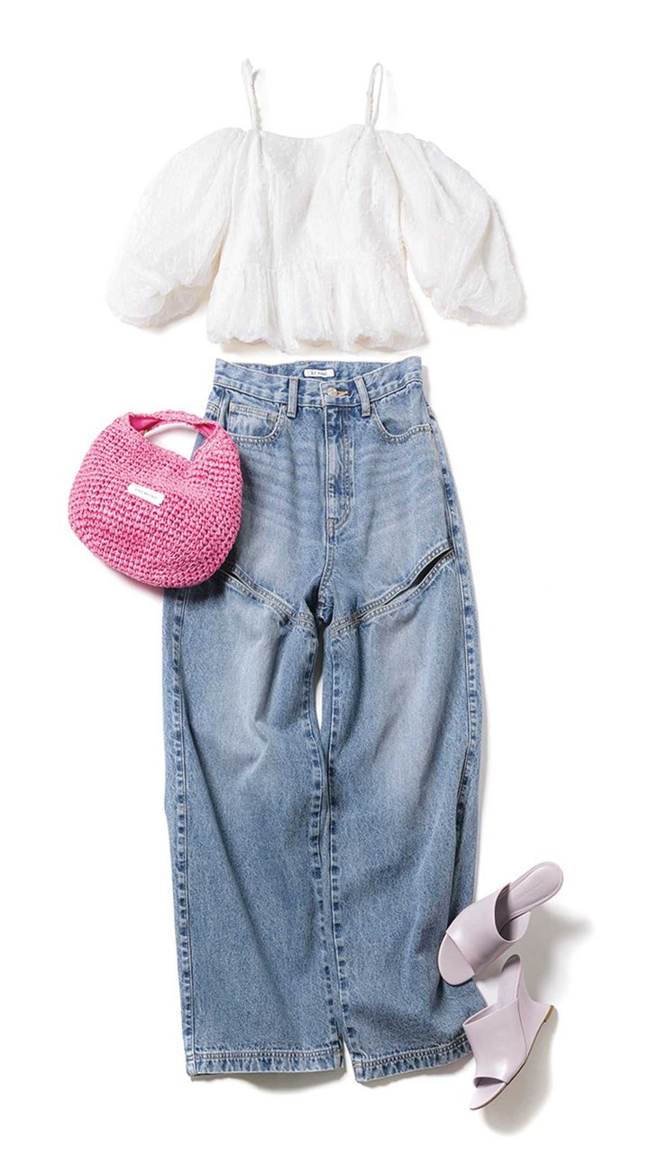 ふんわりとしたボリュームトップスを選ぶ時は、肩やお腹など、肌見せデザインで抜け感を。カットアウトデザインのデニムで、太ももをチラッと見せて、メリハリを。