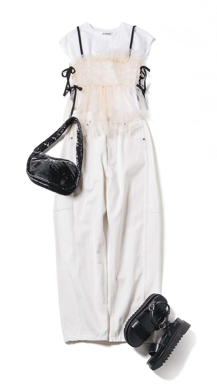 リボンがアクセントになったチュールビスチェが主役。シルエットが今どきなカーヴィーデニムで爽やかに。