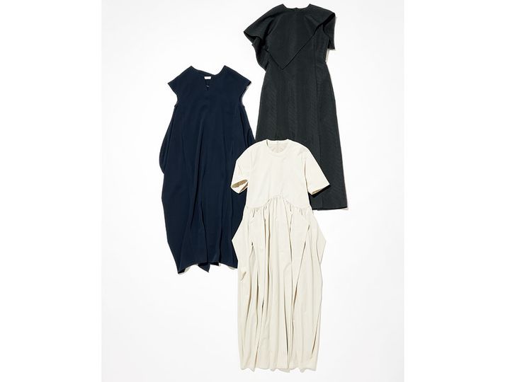 〈上〉顔周りを華やかに演出すアシメトリー。ワンピース¥57,200(LE PHIL/LE PHIL NEWoMan 新宿店)〈中〉バックに大きくフリルがあしらわれたデザイン性の高い一枚。ワンピース¥52,800(アドーア)〈下〉やさしげなアイボリー&ストレスフリーなカットソー素材。ワンピース¥42,900(アンスリード/アンスリード青山店)