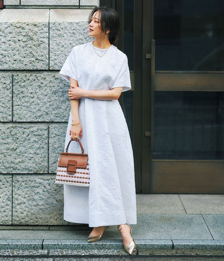 ワンピース¥121,000(ebure/リトルリーグ インク)バッグ¥603,900(ロジェ ヴィヴィエ/ロジェ・ヴィヴィエ・ジャパン)パンプス¥17,600(ダイアナ/ダイアナ 銀座本店)ピアス¥69,300(モニス/フォーティーン ショールーム)ネックレス¥44,000ブレスレット¥70,400(ともにブランイリス/ブランイリス トーキョー)リング[右手]¥15,400(エムシー・スタジオ/ズットホリック)リング[左手薬指]¥165,000リング[左手中指]¥605,000(ともにマリハ)