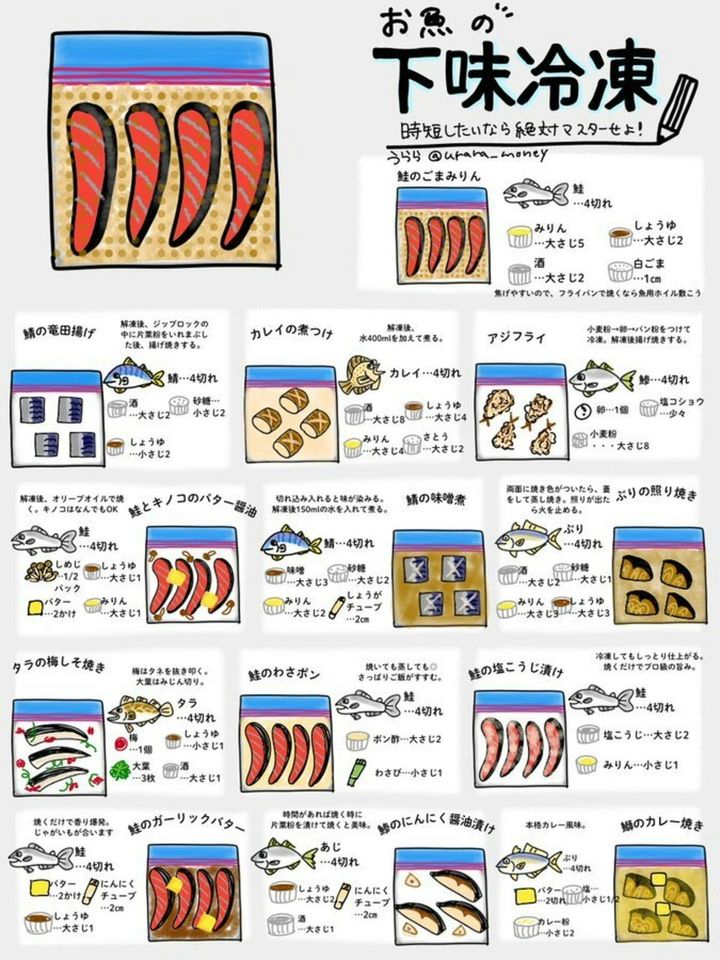 投稿者・うらら(@urara_money)さんは「切り身を買って下味冷凍しておけば、食卓に出すハードルがグッと下がる」とお魚の下味冷凍レシピ【13種】を投稿。魚の下味のレパートリーを増やしたい方も必見です!今日はどれにしようかな?と選ぶ楽しみもできますね。