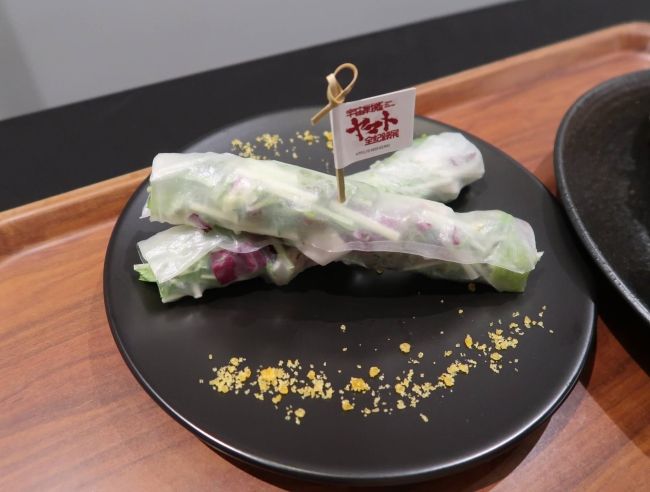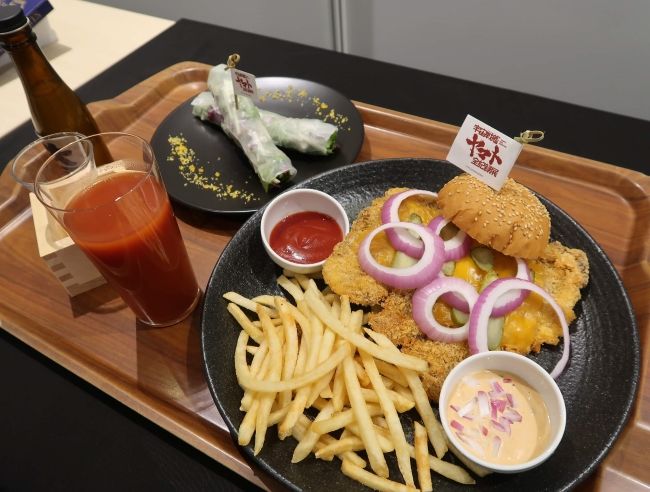 「レトロバー ナンバー10」の「ガミラス艦生春巻き」(1000円)と「波動砲バーガー」(3200円)。こちらでは特別メニューをオーダーすると、コラボランチョンマットがもらえるという特典も!