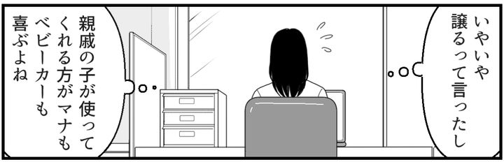 私(サナ)は、夫のケイゴと大学のサークルで出会って結婚。娘のマナが生まれたときには、サークル仲間がお金を出しあって高価なベビーカーを贈ってくれました。そんなマナも現在3歳。ある日、義実家で会った義妹モモカさんから「ベビーカーを譲ってほしい」とお願いされます。わが家はひとりっ子と決めているため、おそらくもう使うことはありません。いずれフリマアプリで売ることも考えていたので、「いいですよ」と快諾したのでした。